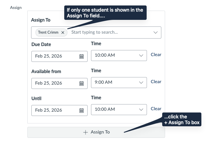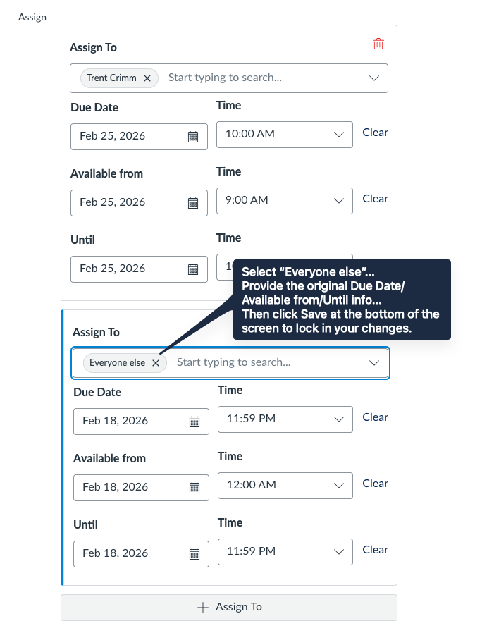 Nodding their head, the benevolent, charismatic, and appealingly-charming Canvas Admin would assign “Everyone else” to the quiz and include the previous date/time info to prevent students from taking the quiz in the future: